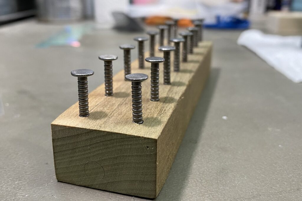 You’ll need something to place your eyes on while they cure if your going with resin or epoxy eyes and the most common way I’ve seen people do this (myself included) is to take a small piece of wood and evenly place screws or nails vertically into the wood about an inch apart from one another.